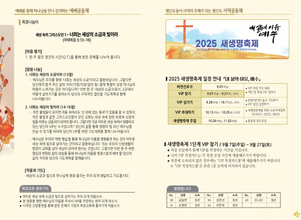 2025년 9월 14일 주보 페이지 정보 작성자 관리지기 작성일25-09-13 11:38 조회1,048회 댓글0건 관련링크 목록 본문 2025년 9월 14일 주보 댓글목록 등록된 댓글이 없습니다. 목록