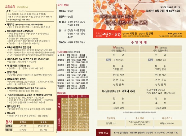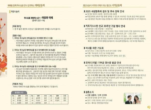 2025년 11월 9일 주보 페이지 정보 작성자 관리지기 작성일25-11-08 10:53 조회751회 댓글0건 관련링크 목록 본문 2025년 11월 9일 주보 댓글목록 등록된 댓글이 없습니다. 목록