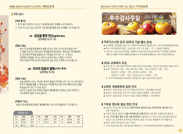 2025년 11월 16일 주보 페이지 정보 작성자 관리지기 작성일25-11-15 10:46 조회660회 댓글0건 관련링크 목록 본문 2025년 11월 16일 주보 댓글목록 등록된 댓글이 없습니다. 목록