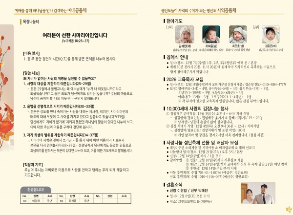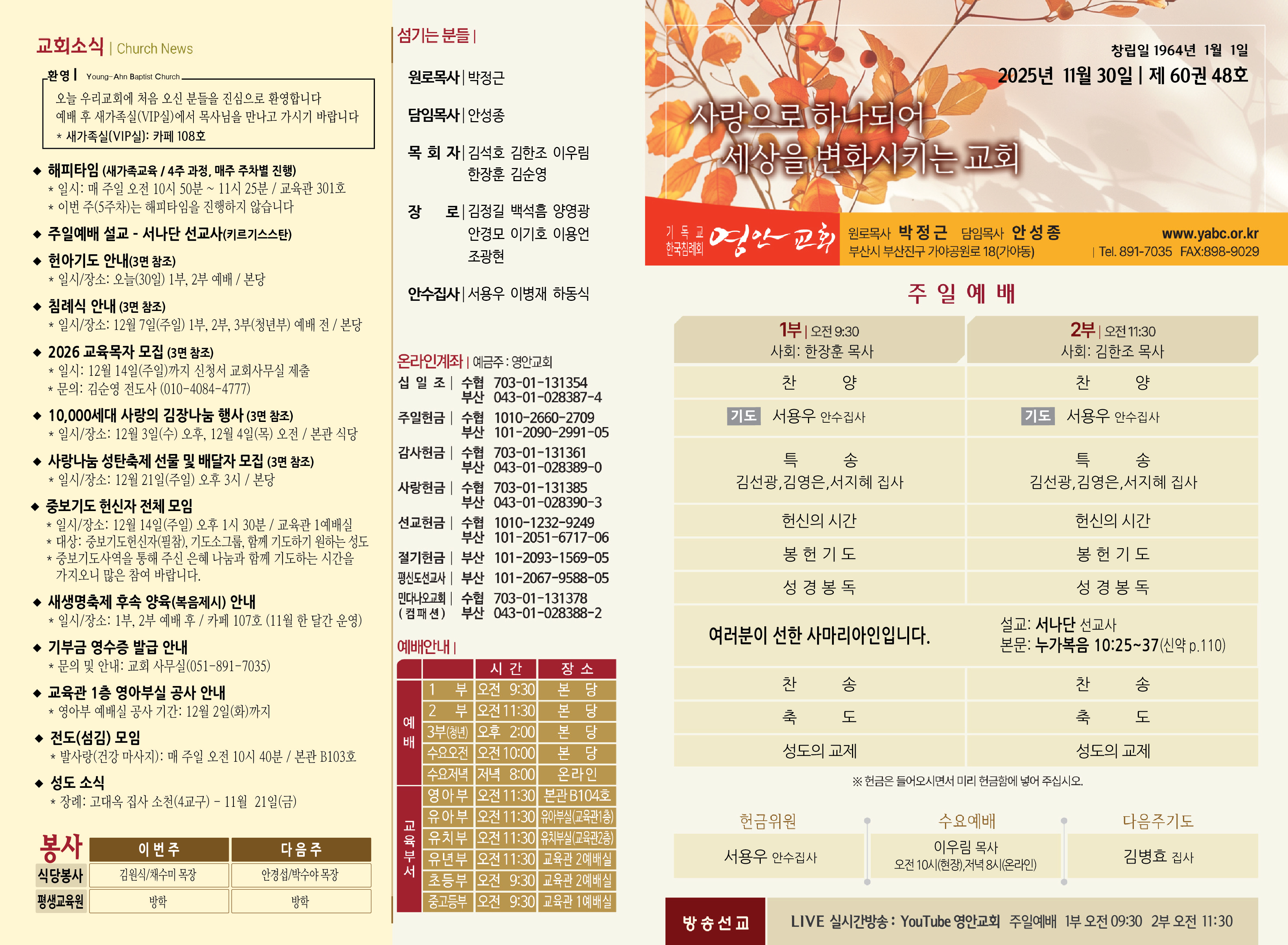 2025년 11월 30일 주보 페이지 정보 작성자 관리지기 작성일25-11-29 10:42 조회547회 댓글0건 관련링크 목록 본문 2025년 11월 30일 주보 댓글목록 등록된 댓글이 없습니다. 목록