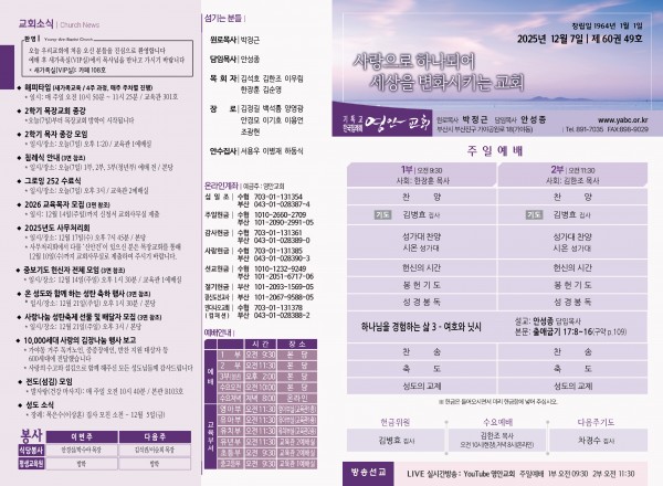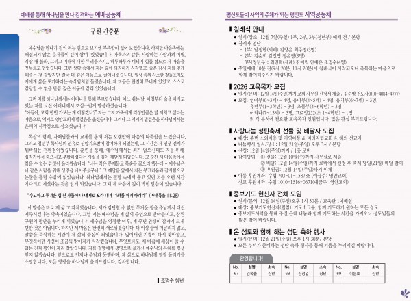 2025년 12월 7일 주보 페이지 정보 작성자 관리지기 작성일25-12-06 10:36 조회636회 댓글0건 관련링크 목록 본문 2025년 12월 7일 주보 댓글목록 등록된 댓글이 없습니다. 목록