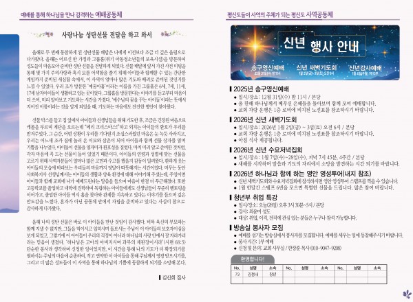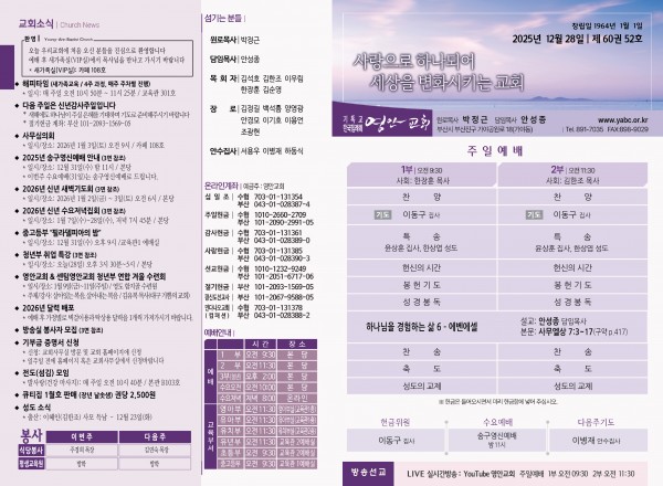 2025년 12월 28일 주보 페이지 정보 작성자 관리지기 작성일25-12-27 10:20 조회745회 댓글0건 관련링크 목록 본문 2025년 12월 28일 주보 댓글목록 등록된 댓글이 없습니다. 목록