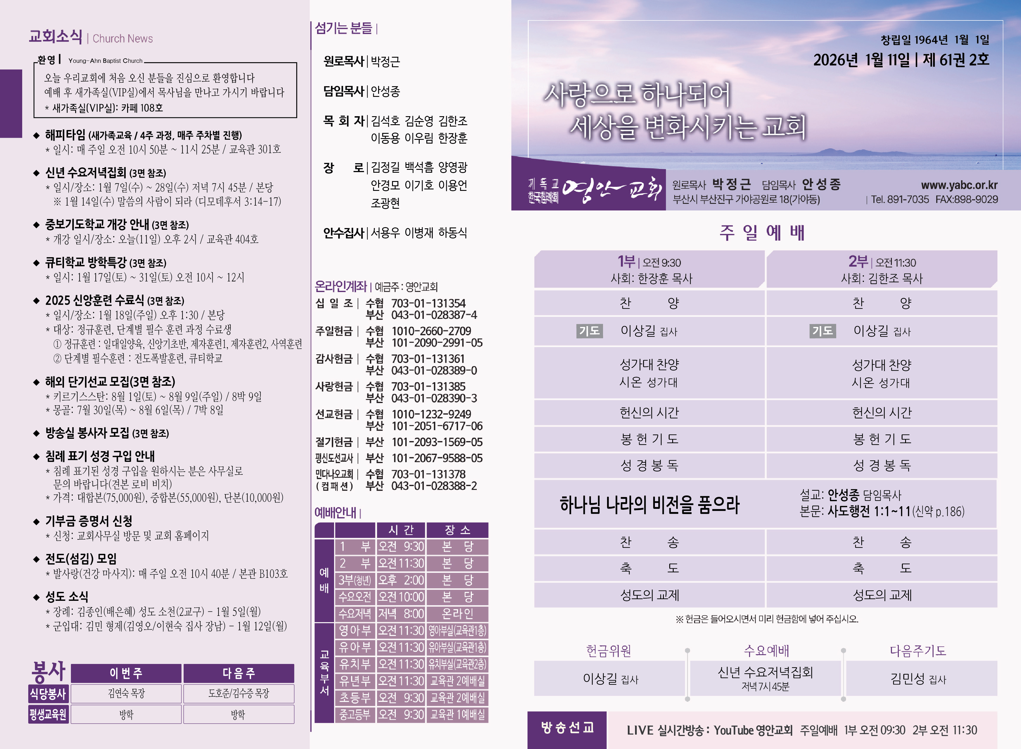 2026년 1월 11일 주보 페이지 정보 작성자 관리지기 작성일26-01-10 10:28 조회632회 댓글0건 관련링크 목록 본문 2026년 1월 11일 주보 댓글목록 등록된 댓글이 없습니다. 목록