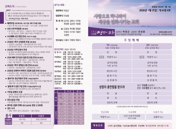 2026년 1월 25일 주보 페이지 정보 작성자 관리지기 작성일26-01-24 10:35 조회340회 댓글0건 관련링크 목록 본문 2026년 1월 25일 주보 댓글목록 등록된 댓글이 없습니다. 목록