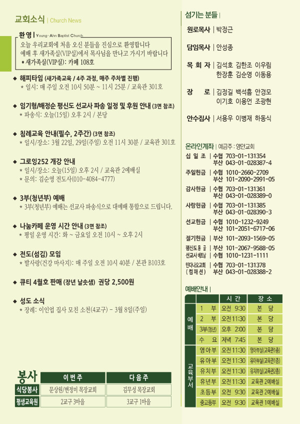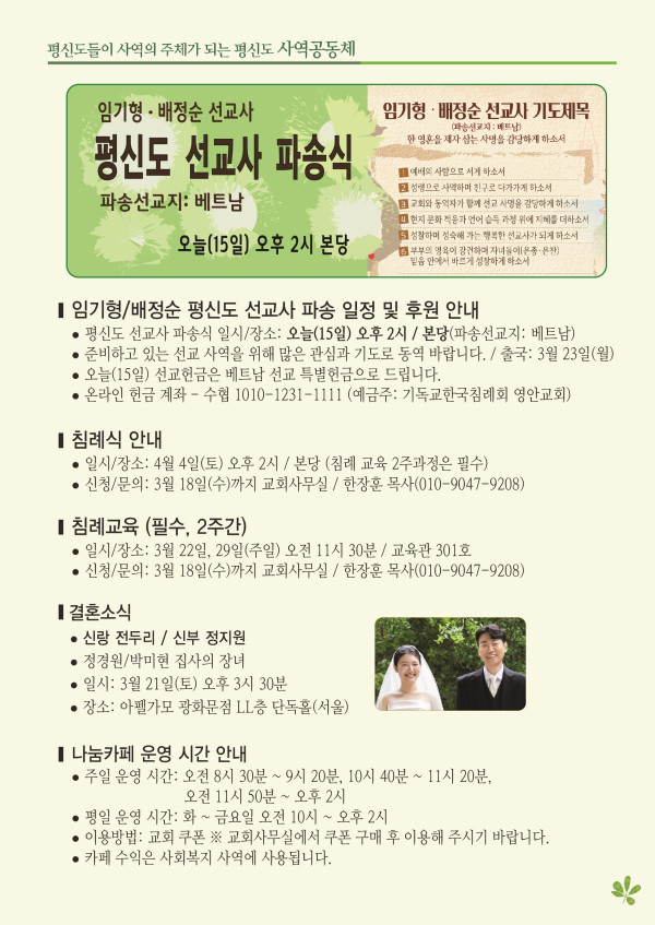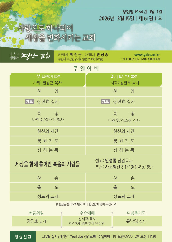 2026년 3월 15일 주보 페이지 정보 작성자 관리지기 작성일26-03-14 11:19 조회1,196회 댓글0건 관련링크 목록 본문 2026년 3월 15일 주보 댓글목록 등록된 댓글이 없습니다. 목록