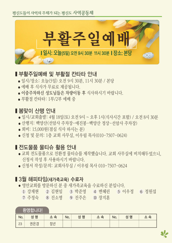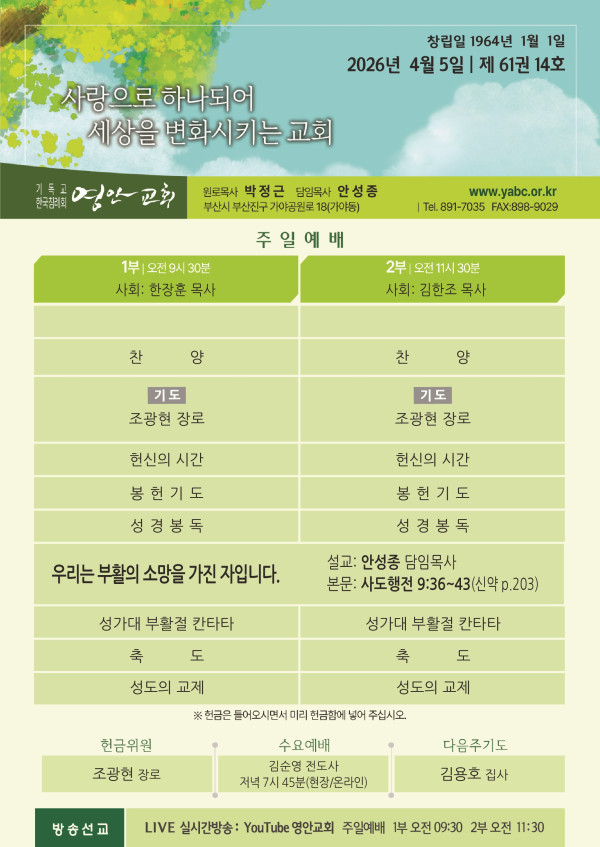2026년 4월 5일 주보 페이지 정보 작성자 관리지기 작성일26-04-04 10:18 조회658회 댓글0건 관련링크 목록 본문 2026년 4월 5일 주보 댓글목록 등록된 댓글이 없습니다. 목록