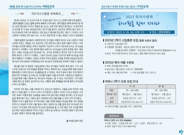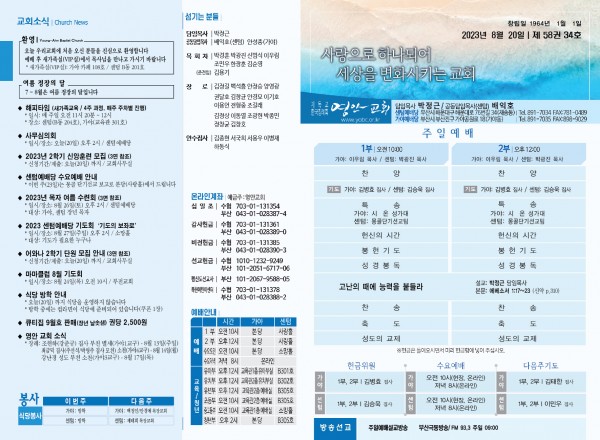 2023년 8월 20일 주보 (센텀예배당) 페이지 정보 작성자 관리지기 작성일23-08-19 10:09 조회2,967회 댓글0건 관련링크 목록 본문 2023년 8월 20일 주보 (센텀예배당) 댓글목록 등록된 댓글이 없습니다. 목록