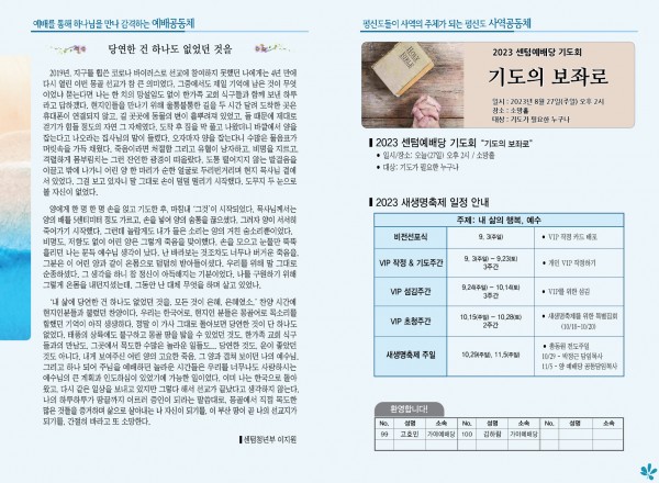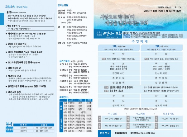 2023년 8월 27일 주보 (센텀예배당) 페이지 정보 작성자 관리지기 작성일23-08-26 10:37 조회2,829회 댓글0건 관련링크 목록 본문 2023년 8월 27일 주보 (센텀예배당) 댓글목록 등록된 댓글이 없습니다. 목록