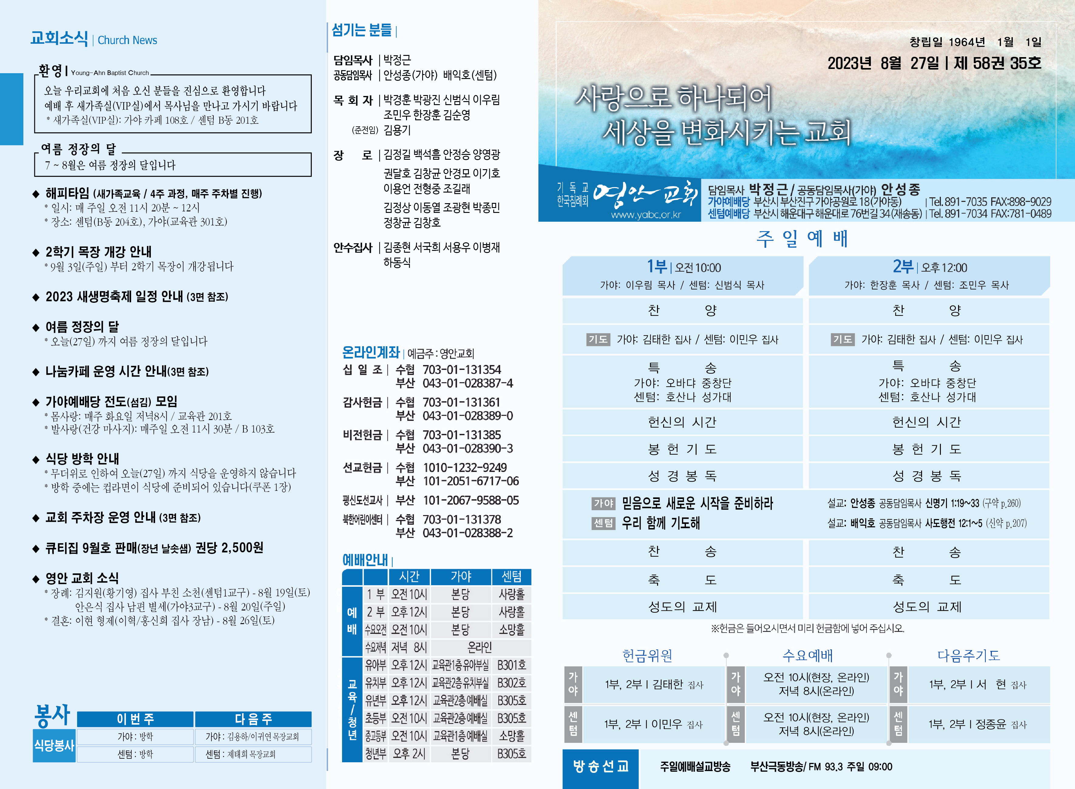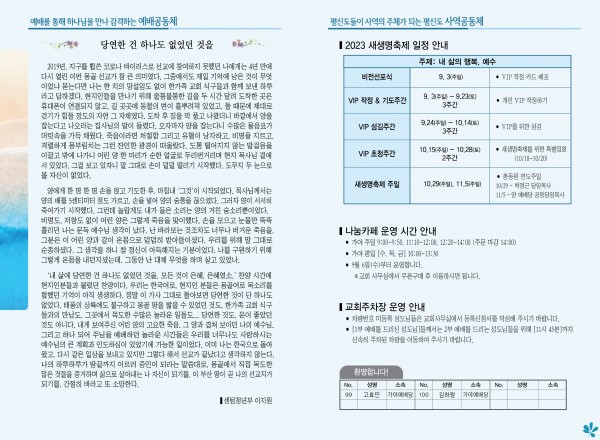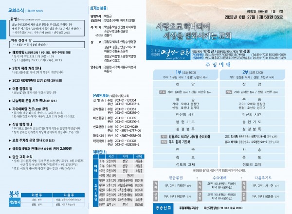 2023년 8월 27일 주보 (가야예배당) 페이지 정보 작성자 관리지기 작성일23-08-26 11:18 조회2,924회 댓글0건 관련링크 목록 본문 2023년 8월 27일 주보 (가야예배당) 댓글목록 등록된 댓글이 없습니다. 목록