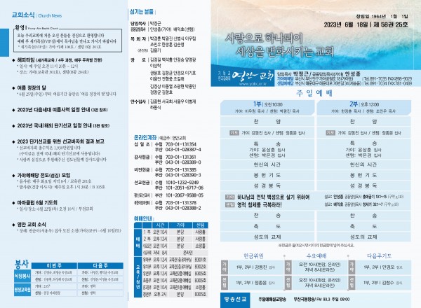 2023년 6월 18일 주보 (가야예배당) 페이지 정보 작성자 관리지기 작성일23-06-17 11:52 조회3,245회 댓글0건 관련링크 목록 본문 * 2023년 6월 18일 주보 (가야예배당) 댓글목록 등록된 댓글이 없습니다. 목록