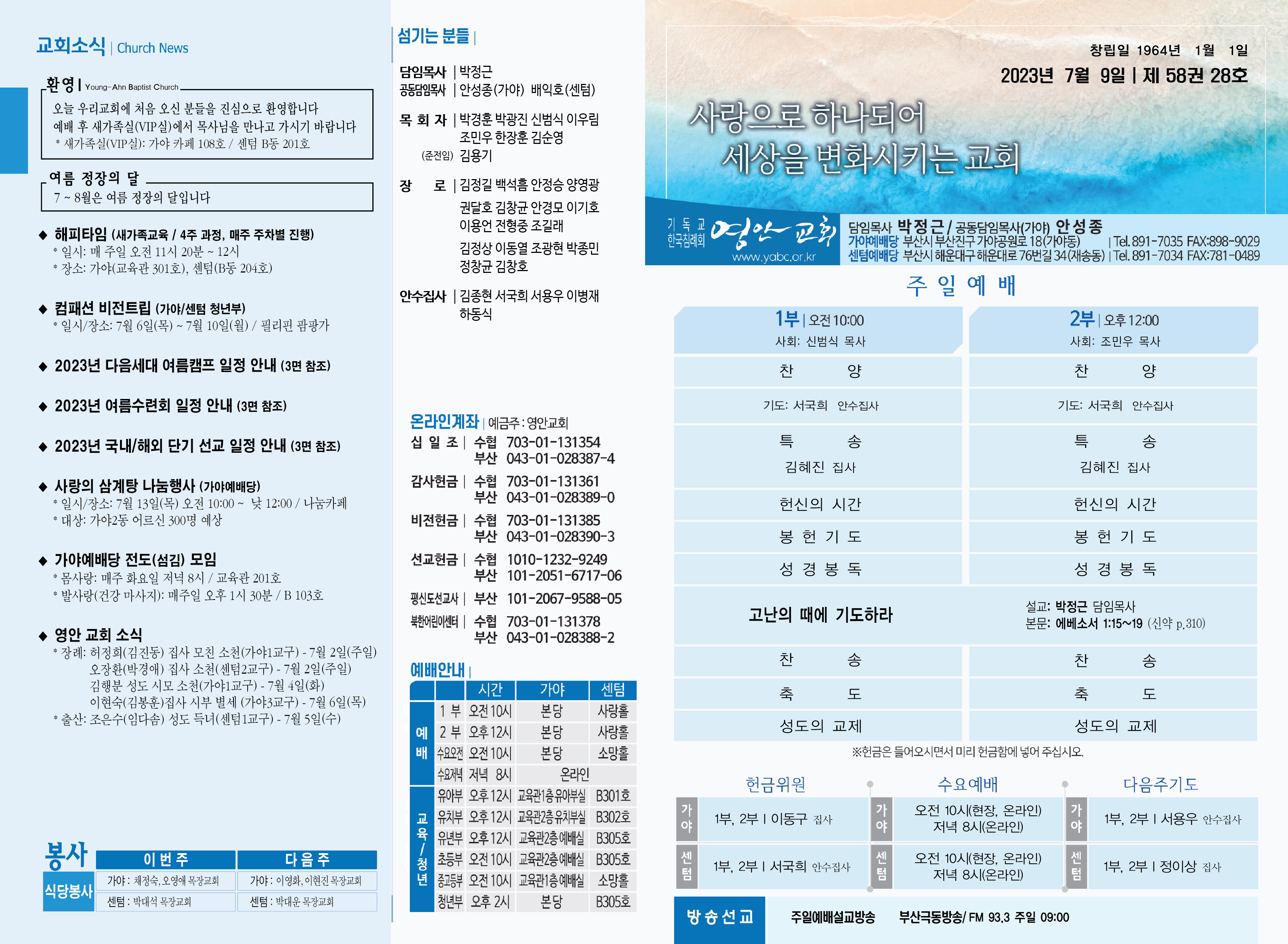 2023년 7월 9일 주보 (가야예배당) 페이지 정보 작성자 관리지기 작성일23-07-08 11:27 조회3,120회 댓글0건 관련링크 목록 본문 2* 023년 7월 9일 주보 (가야예배당) 댓글목록 등록된 댓글이 없습니다. 목록
