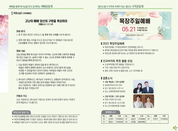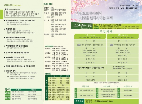 2023년 5월 14일 주보 (가야예배당) 페이지 정보 작성자 관리지기 작성일23-05-13 11:05 조회3,384회 댓글0건 관련링크 목록 본문 * 2023년 5월 14일 주보 (가야예배당) 댓글목록 등록된 댓글이 없습니다. 목록