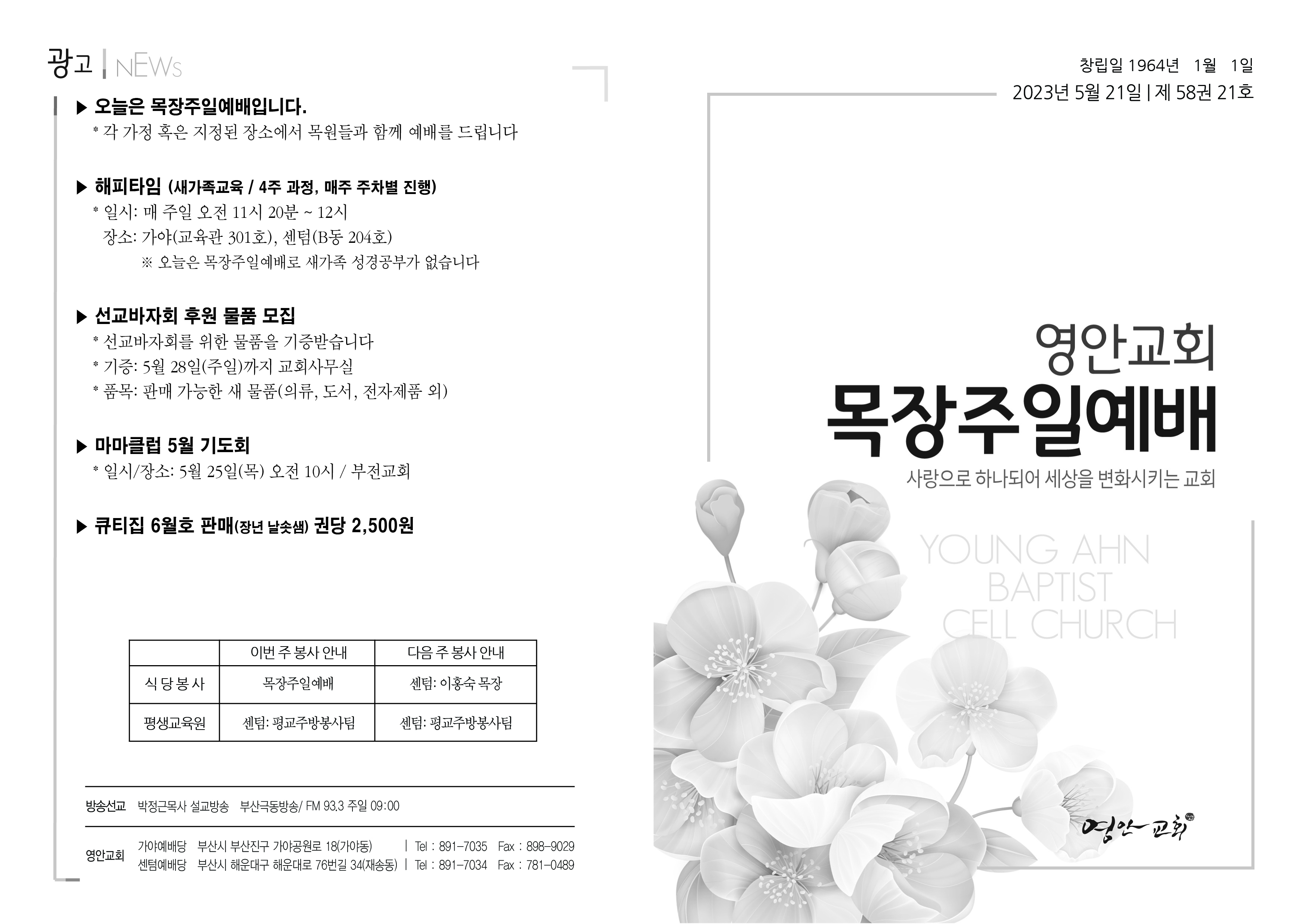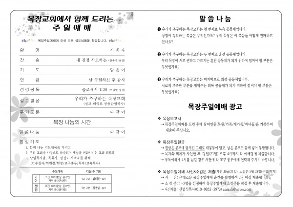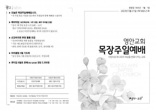 2023년 5월 21일 주보 (센텀예배당)_목장주일예배 페이지 정보 작성자 관리지기 작성일23-05-20 10:17 조회3,039회 댓글0건 관련링크 목록 본문 2023년 5월 21일 주보 (센텀예배당)_목장주일예배 댓글목록 등록된 댓글이 없습니다. 목록