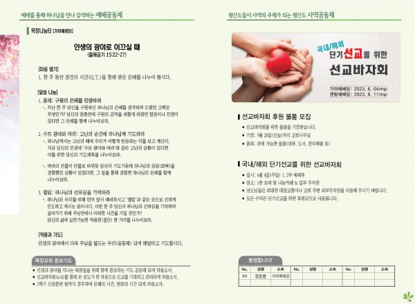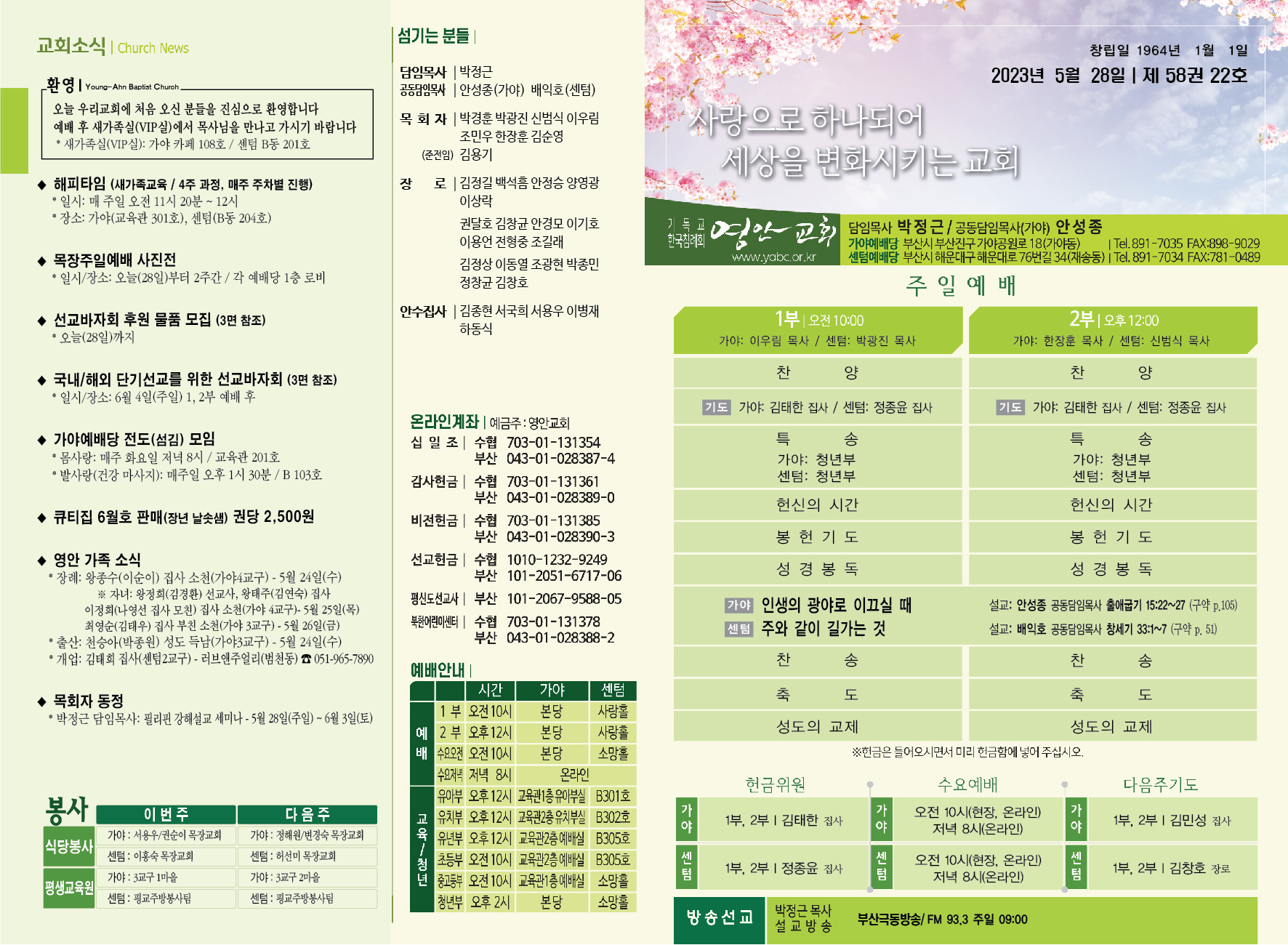 2023년 5월 28일 주보 (가야예배당) 페이지 정보 작성자 관리지기 작성일23-05-27 13:33 조회3,326회 댓글0건 관련링크 목록 본문 * 2023년 5월 28일 주보 (가야예배당) 댓글목록 등록된 댓글이 없습니다. 목록