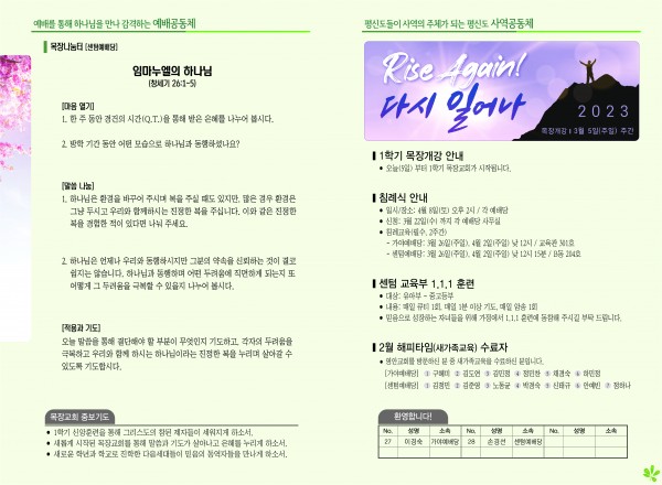 2023년 3월 5일 주보 (센텀예배당) 페이지 정보 작성자 관리지기 작성일23-03-04 11:28 조회3,593회 댓글0건 관련링크 목록 본문 2023년 3월 5일 주보 (센텀예배당) 댓글목록 등록된 댓글이 없습니다. 목록