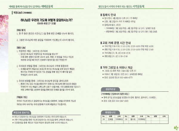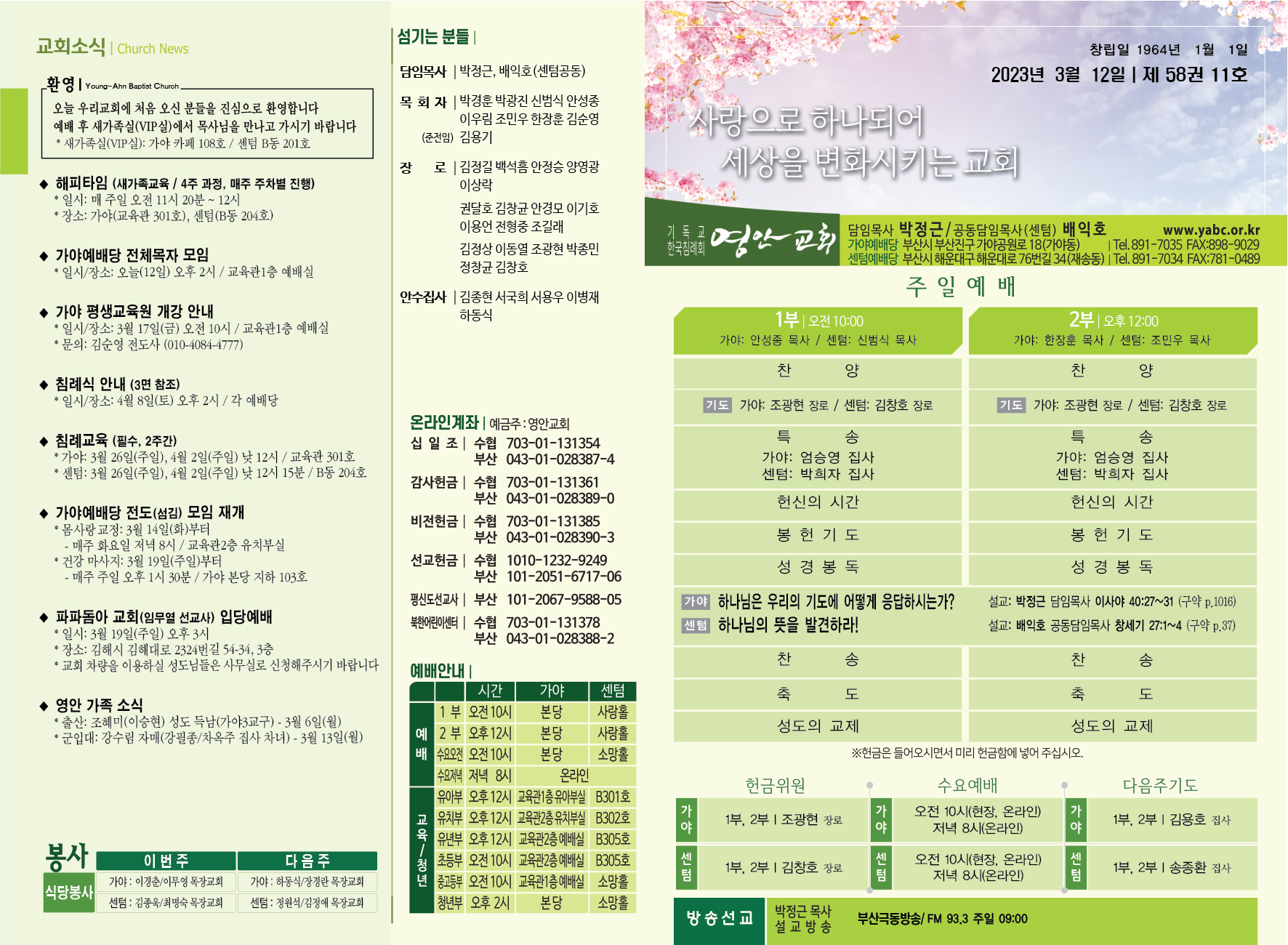 2023년 3월 12일 주보 (가야 예배당) 페이지 정보 작성자 관리지기 작성일23-03-11 11:12 조회4,007회 댓글0건 관련링크 목록 본문 * 2023년 3월 12일 주보 (가야 예배당) 댓글목록 등록된 댓글이 없습니다. 목록