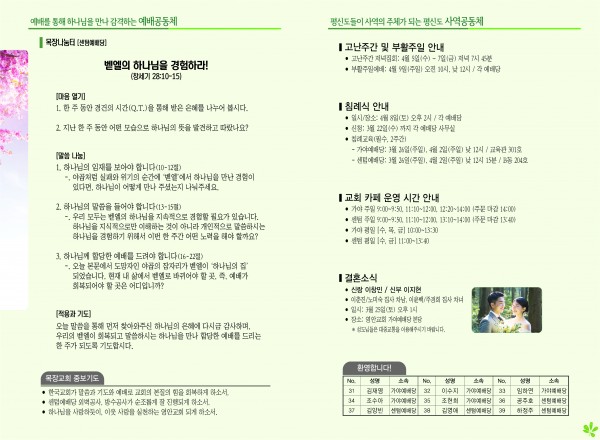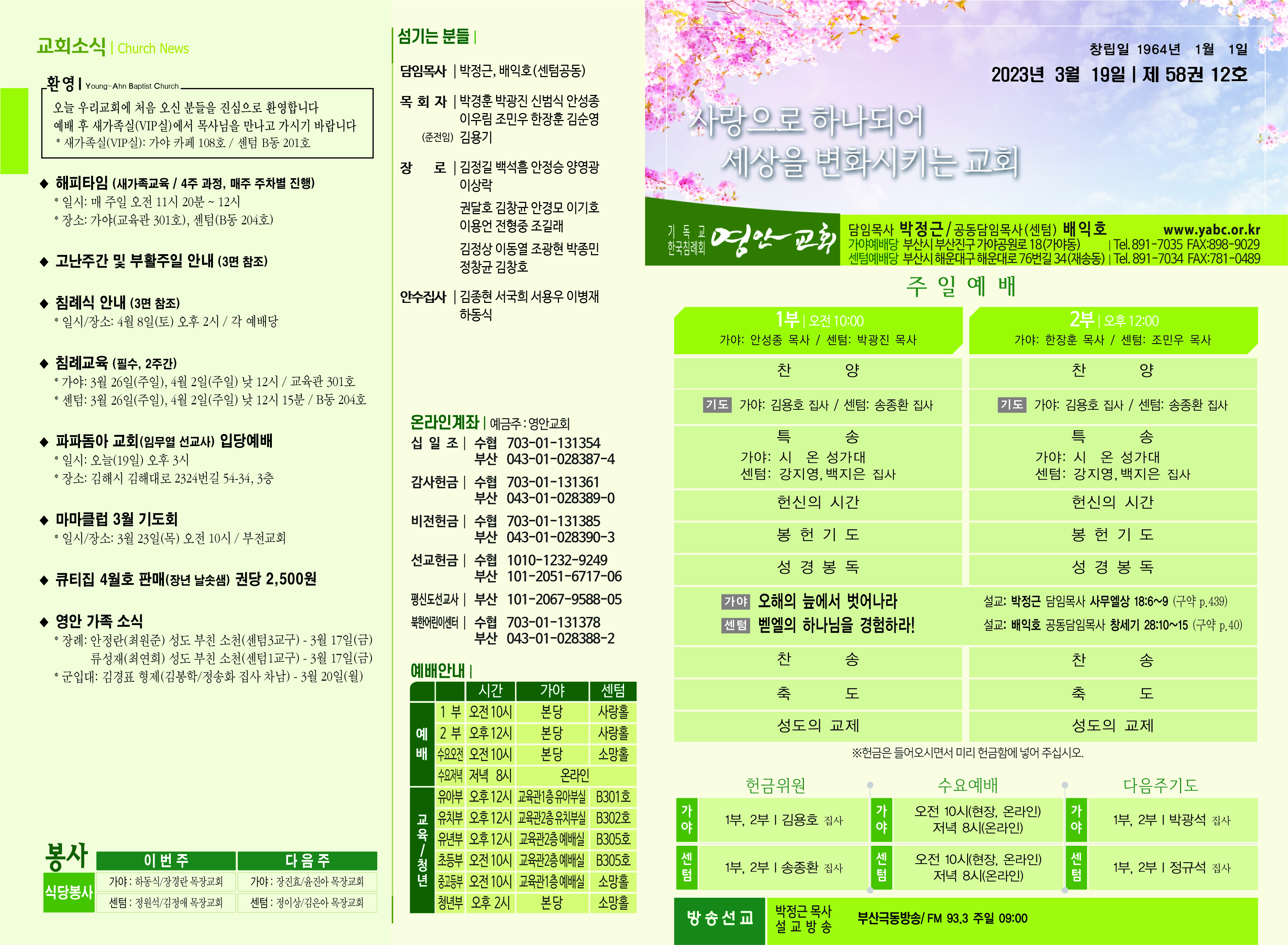 2023년 3월 19일 주보 (센텀예배당) 페이지 정보 작성자 관리지기 작성일23-03-18 11:11 조회3,293회 댓글0건 관련링크 목록 본문 2023년 3월 19일 주보 (센텀예배당) 댓글목록 등록된 댓글이 없습니다. 목록