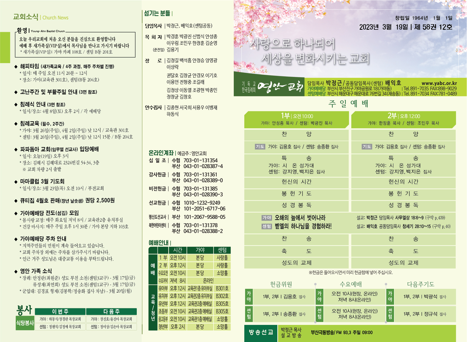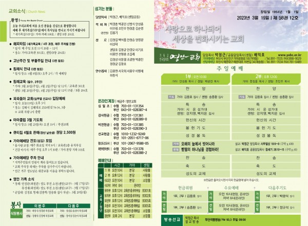 2023년 3월 19일 주보 (가야예배당) 페이지 정보 작성자 관리지기 작성일23-03-18 11:27 조회3,620회 댓글0건 관련링크 목록 본문 *2023년 3월 19일 주보 (가야예배당) 댓글목록 등록된 댓글이 없습니다. 목록
