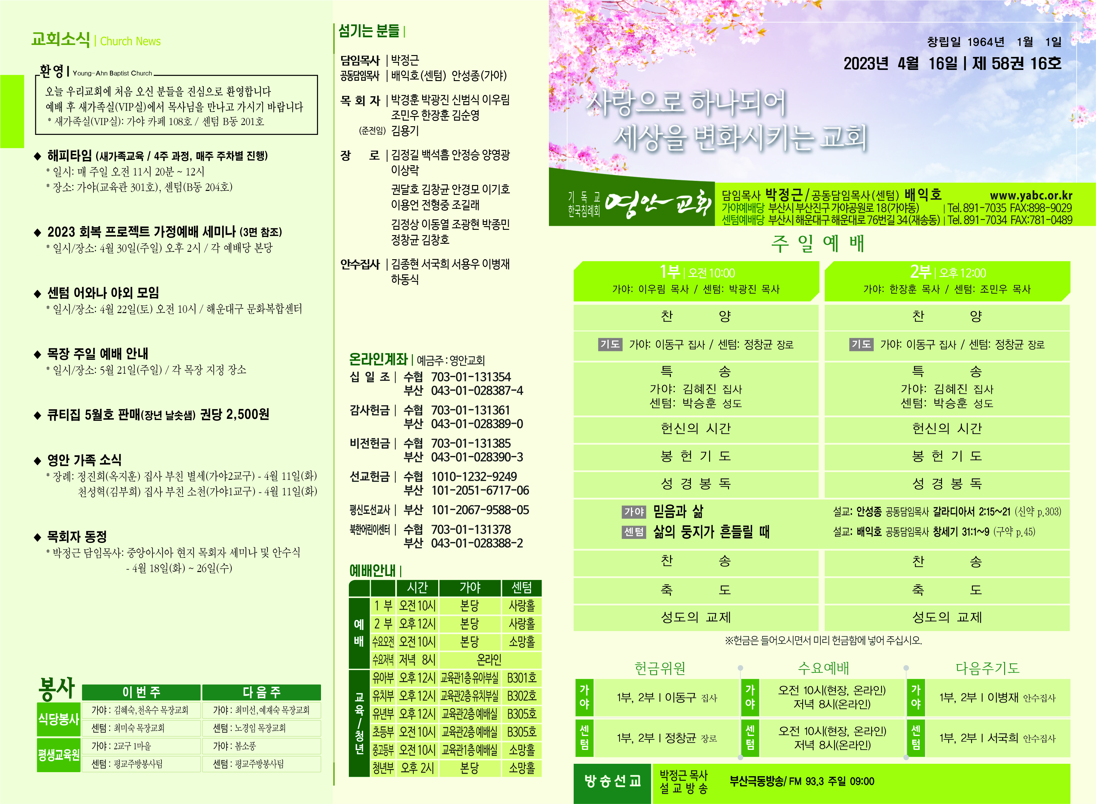 2023년 4월 16일 주보 (센텀예배당) 페이지 정보 작성자 관리지기 작성일23-04-15 11:17 조회3,331회 댓글0건 관련링크 목록 본문 2023년 4월 16일 주보 (센텀예배당) 댓글목록 등록된 댓글이 없습니다. 목록