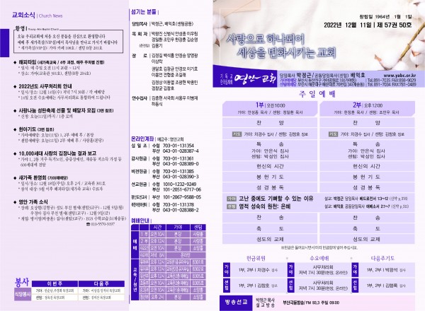 2022년 12월 11일 주보 페이지 정보 작성자 관리지기 작성일22-12-10 11:03 조회3,937회 댓글0건 관련링크 목록 본문 2022년 12월 11일 주보 댓글목록 등록된 댓글이 없습니다. 목록