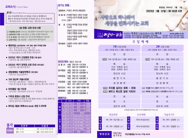 2023년 1월 22일 주보 페이지 정보 작성자 관리지기 작성일23-01-20 11:45 조회3,881회 댓글0건 관련링크 목록 본문 * 2023년 1월 22일 주보 댓글목록 등록된 댓글이 없습니다. 목록