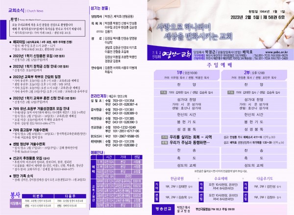 2023년 2월 5일 주보 페이지 정보 작성자 관리지기 작성일23-02-04 11:27 조회3,825회 댓글0건 관련링크 목록 본문 * 2023년 2월 5일 주보 댓글목록 등록된 댓글이 없습니다. 목록