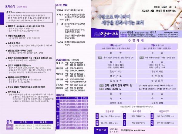 2023년 2월 26일 주보 페이지 정보 작성자 관리지기 작성일23-02-25 12:01 조회3,771회 댓글0건 관련링크 목록 본문 *2023년 2월 26일 주보 댓글목록 등록된 댓글이 없습니다. 목록