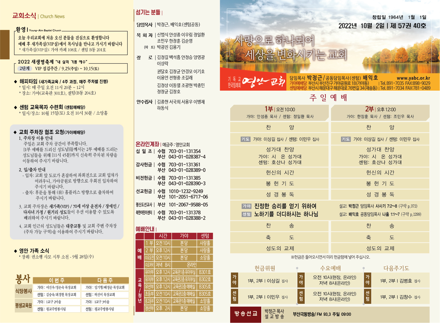 2022년 10월 2일 주보 (가야예배당) 페이지 정보 작성자 관리지기 작성일22-10-01 13:56 조회3,915회 댓글0건 관련링크 목록 본문 2022년 10월 2일 주보 (가야예배당) 댓글목록 등록된 댓글이 없습니다. 목록