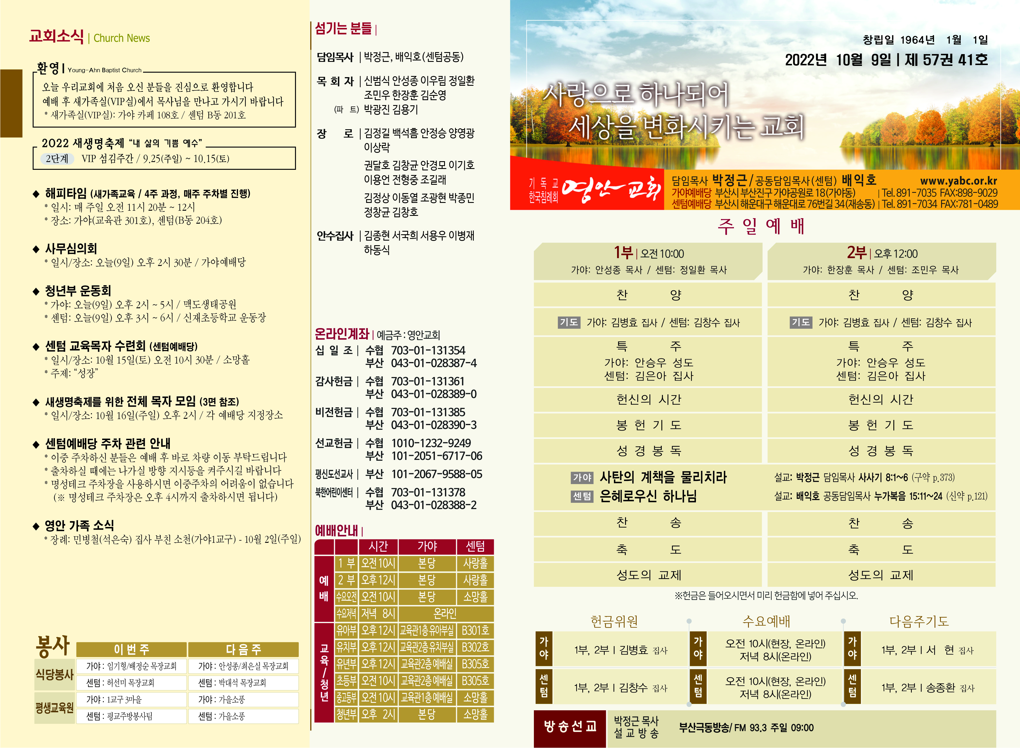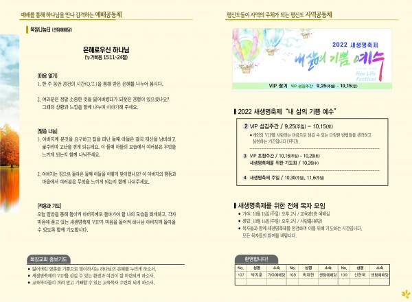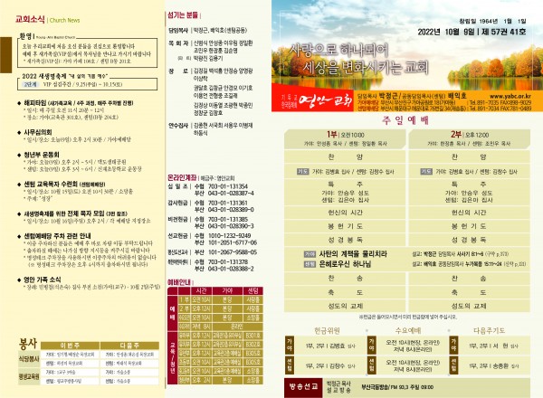 2022년 10월 9일 주보 (센텀예배당) 페이지 정보 작성자 관리지기 작성일22-10-08 11:46 조회3,755회 댓글0건 관련링크 목록 본문 2022년 10월 9일 주보 (센텀예배당) 댓글목록 등록된 댓글이 없습니다. 목록