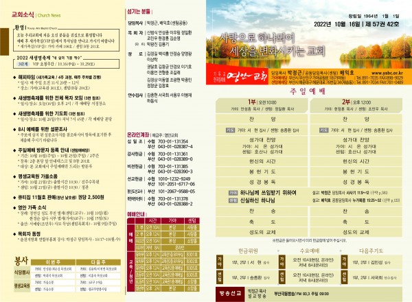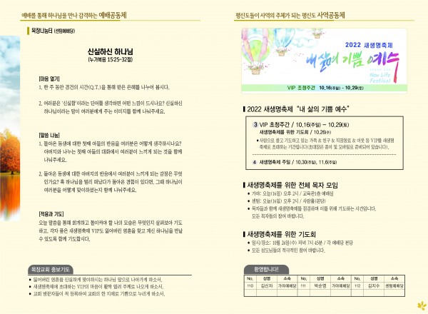 2022년 10월 16일 주보 (센텀예배당) 페이지 정보 작성자 관리지기 작성일22-10-15 11:42 조회3,680회 댓글0건 관련링크 목록 본문 2022년 10월 16일 주보 (센텀예배당) 댓글목록 등록된 댓글이 없습니다. 목록