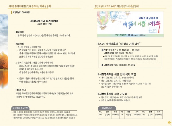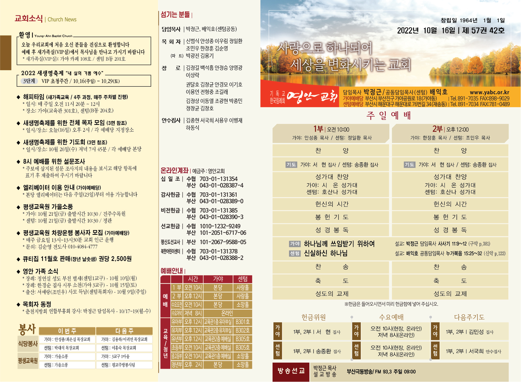 2022년 10월 16일 주보 (가야예배당) 페이지 정보 작성자 관리지기 작성일22-10-15 12:10 조회3,888회 댓글0건 관련링크 목록 본문 * 2022년 10월 16일 주보 (가야예배당) 댓글목록 등록된 댓글이 없습니다. 목록