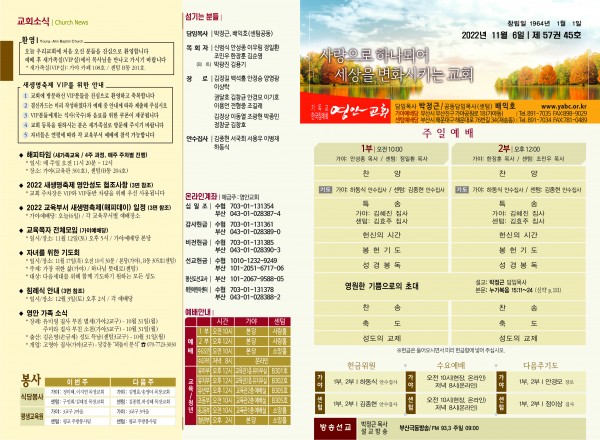2022년 11월 6일 주보 페이지 정보 작성자 관리지기 작성일22-11-05 11:14 조회4,067회 댓글0건 관련링크 목록 본문 * 2022년 11월 6일 주보 댓글목록 등록된 댓글이 없습니다. 목록