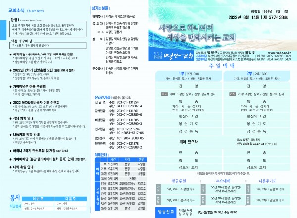 2022년 8월 14일 주보 페이지 정보 작성자 관리지기 작성일22-08-13 12:58 조회3,963회 댓글0건 관련링크 목록 본문 *2022년 8월 14일 주보 댓글목록 등록된 댓글이 없습니다. 목록