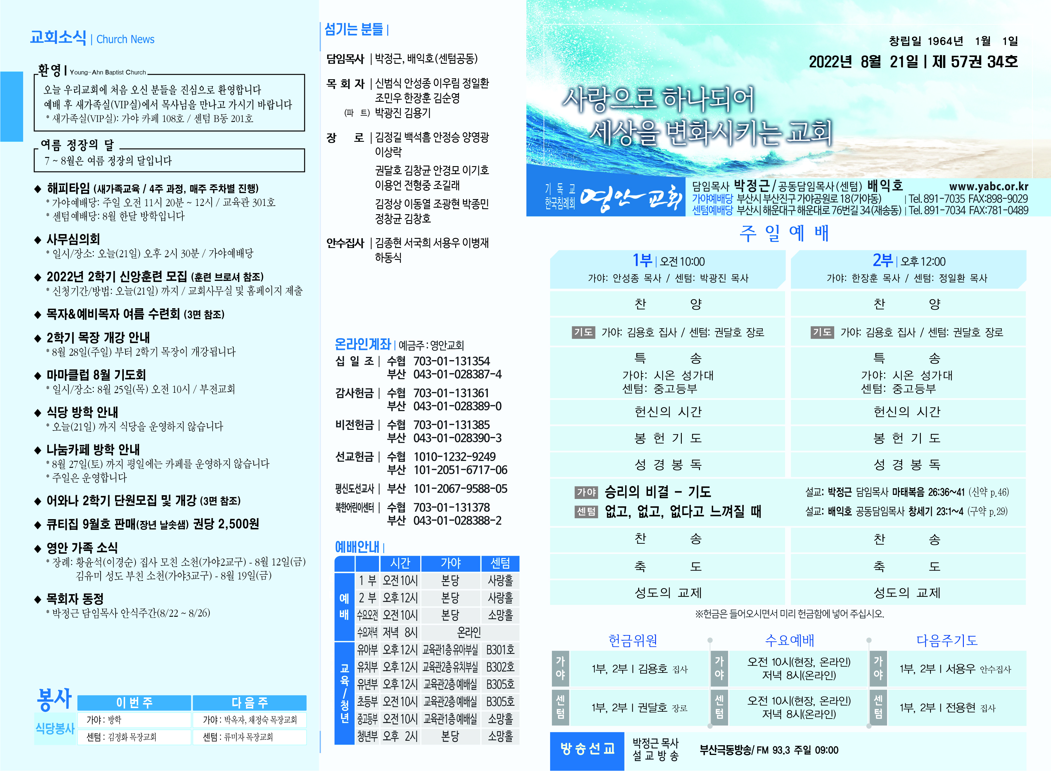 2022년 8월 21일 주보 페이지 정보 작성자 관리지기 작성일22-08-20 11:27 조회4,228회 댓글0건 관련링크 목록 본문 * 2022년 8월 21일 주보 댓글목록 등록된 댓글이 없습니다. 목록