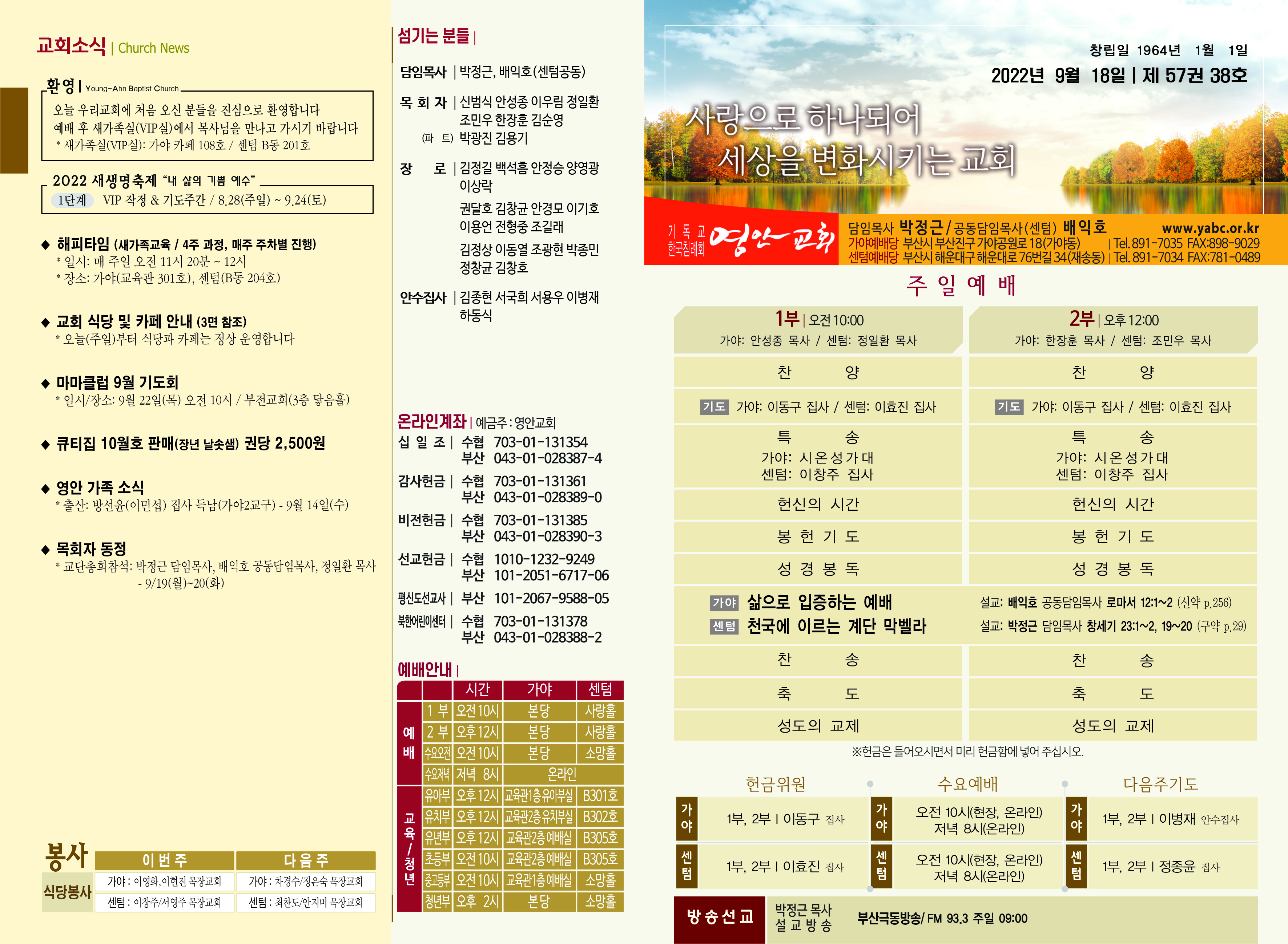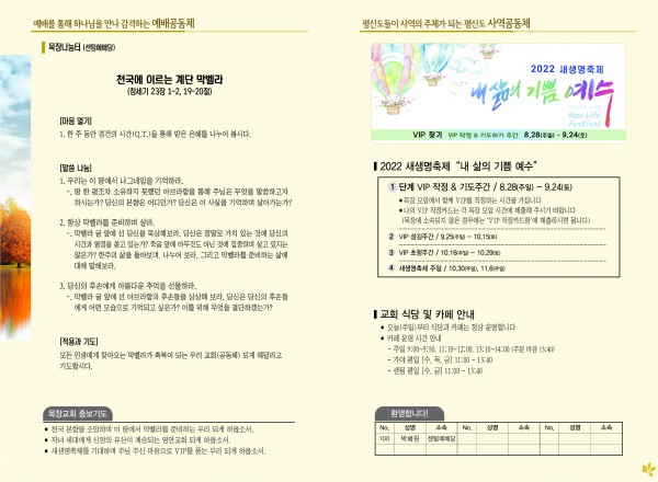 2022년 9월 18일 주보 (센텀예배당) 페이지 정보 작성자 관리지기 작성일22-09-17 11:15 조회3,722회 댓글0건 관련링크 목록 본문 2022년 9월 18일 주보 (센텀예배당) 댓글목록 등록된 댓글이 없습니다. 목록
