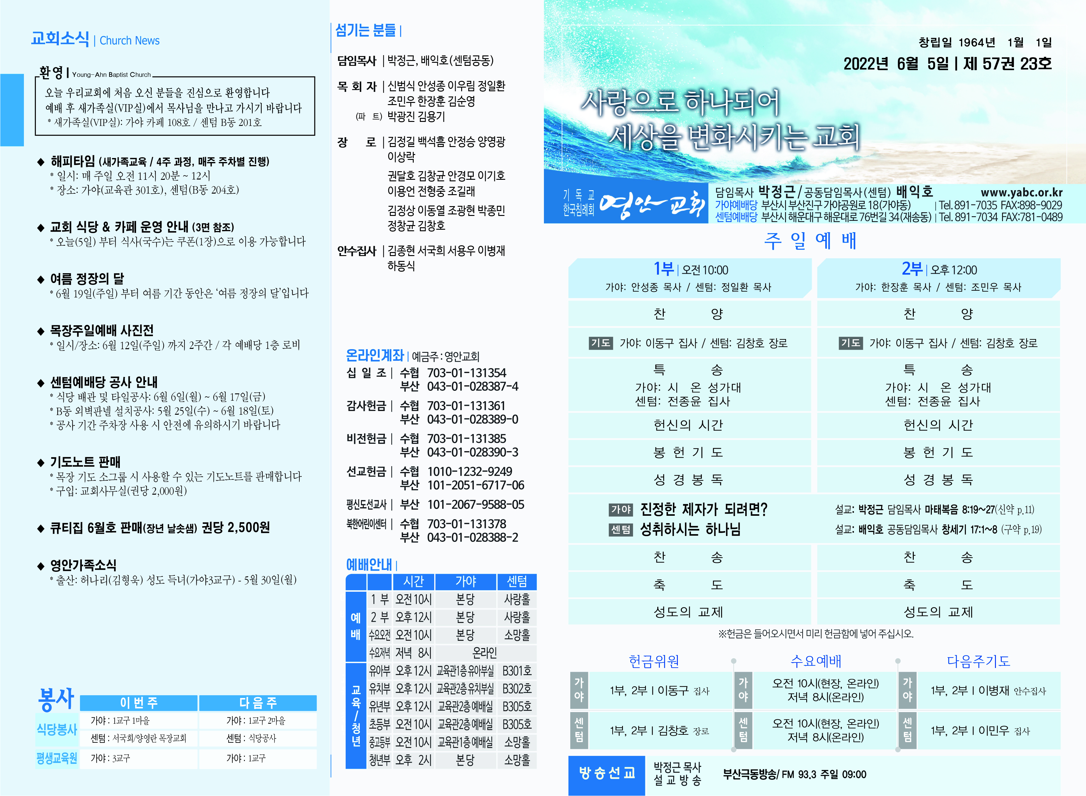 2022년 6월 5일 주보 (가야예배당) 페이지 정보 작성자 관리지기 작성일22-06-04 11:47 조회4,480회 댓글0건 관련링크 목록 본문 * 2022년 6월 5일 주보 (가야예배당) 댓글목록 등록된 댓글이 없습니다. 목록
