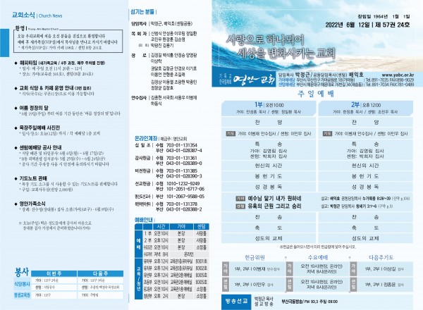 2022년 6월 12일 주보 (가야예배당) 페이지 정보 작성자 관리지기 작성일22-06-11 11:46 조회4,205회 댓글0건 관련링크 목록 본문 * 2022년 6월 12일 주보 (가야예배당) 댓글목록 등록된 댓글이 없습니다. 목록