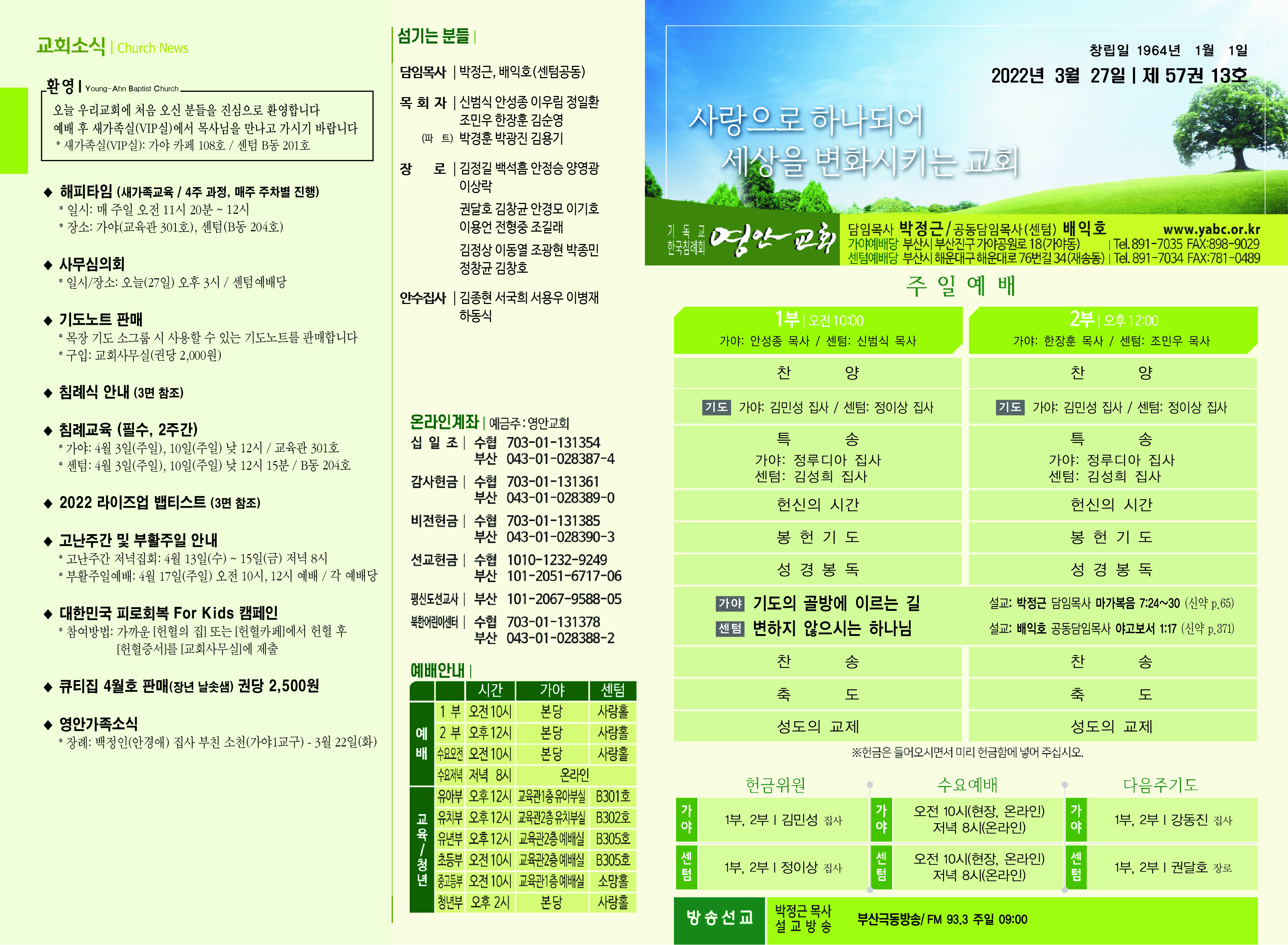 2022년 3월 27일 주보 (센텀예배당) 페이지 정보 작성자 관리지기 작성일22-03-26 12:05 조회4,540회 댓글0건 관련링크 목록 본문 2022년 3월 27일 주보 (센텀예배당) 댓글목록 등록된 댓글이 없습니다. 목록