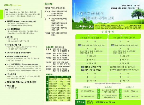 2022년 4월 24일 주보 (센텀예배당) 페이지 정보 작성자 관리지기 작성일22-04-23 11:44 조회4,320회 댓글0건 관련링크 목록 본문 2022년 4월 24일 주보 (센텀예배당) 댓글목록 등록된 댓글이 없습니다. 목록