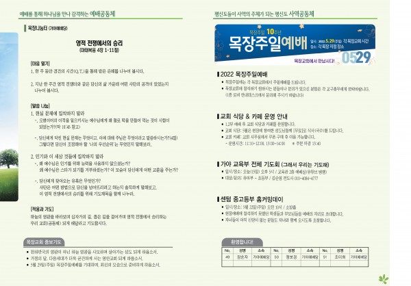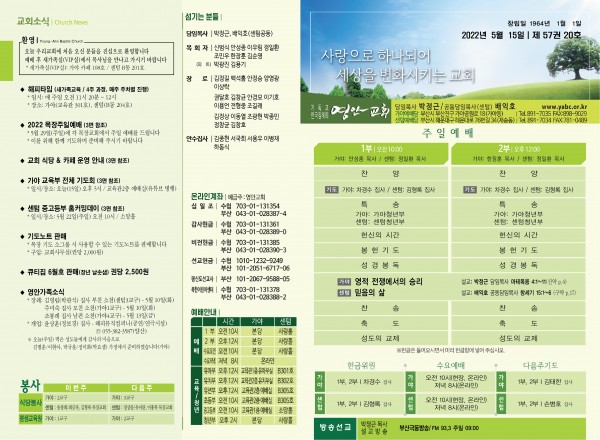 2022년 5월 15일 주보 (가야예배당) 페이지 정보 작성자 관리지기 작성일22-05-14 11:43 조회4,437회 댓글0건 관련링크 목록 본문 * 2022년 5월 15일 주보 (가야예배당) 댓글목록 등록된 댓글이 없습니다. 목록
