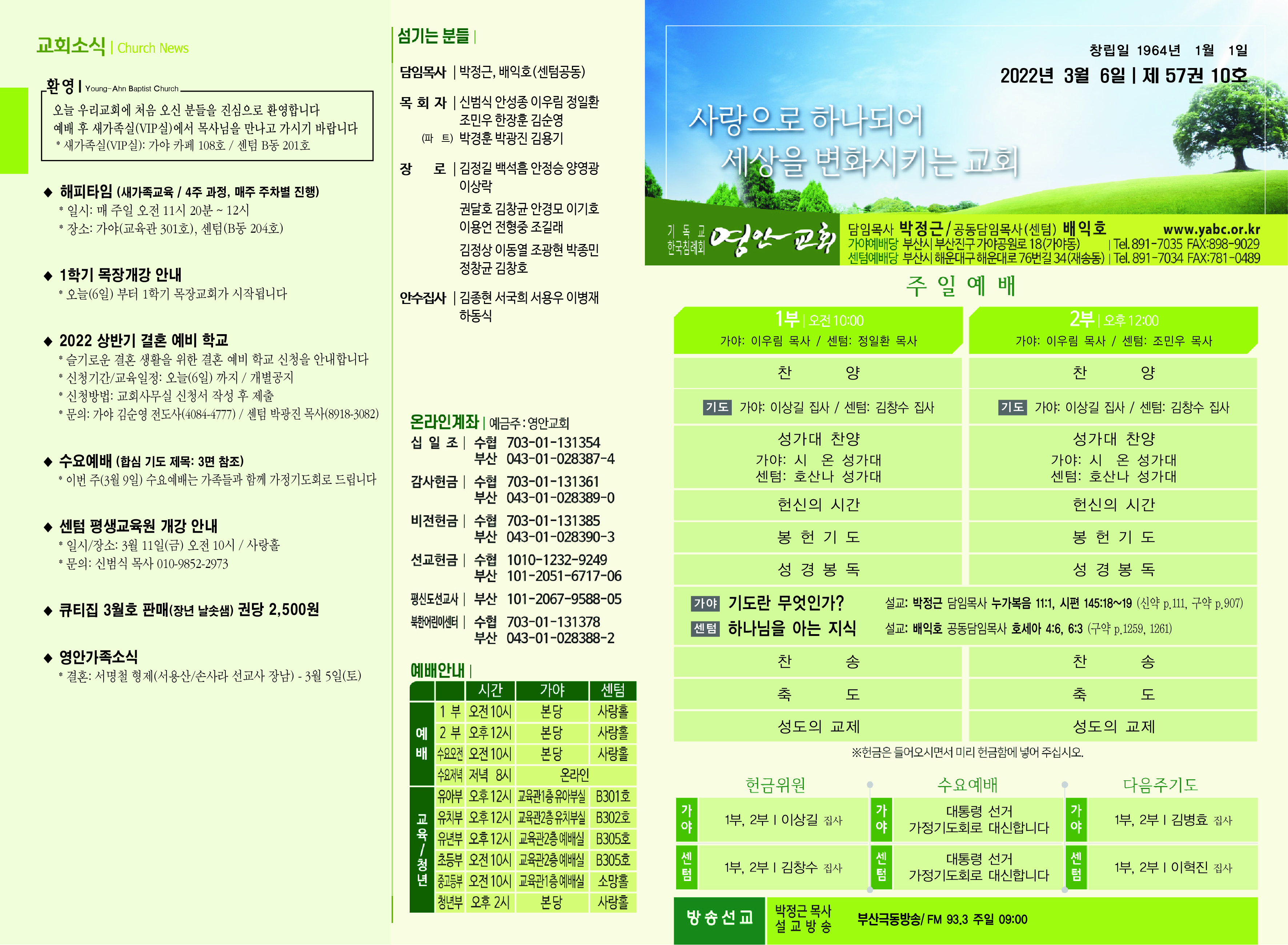 2022년 3월 6일 주보 (가야예배당) 페이지 정보 작성자 관리지기 작성일22-03-05 11:40 조회4,685회 댓글0건 관련링크 목록 본문 2022년 3월 6일 주보 (가야예배당) 댓글목록 등록된 댓글이 없습니다. 목록