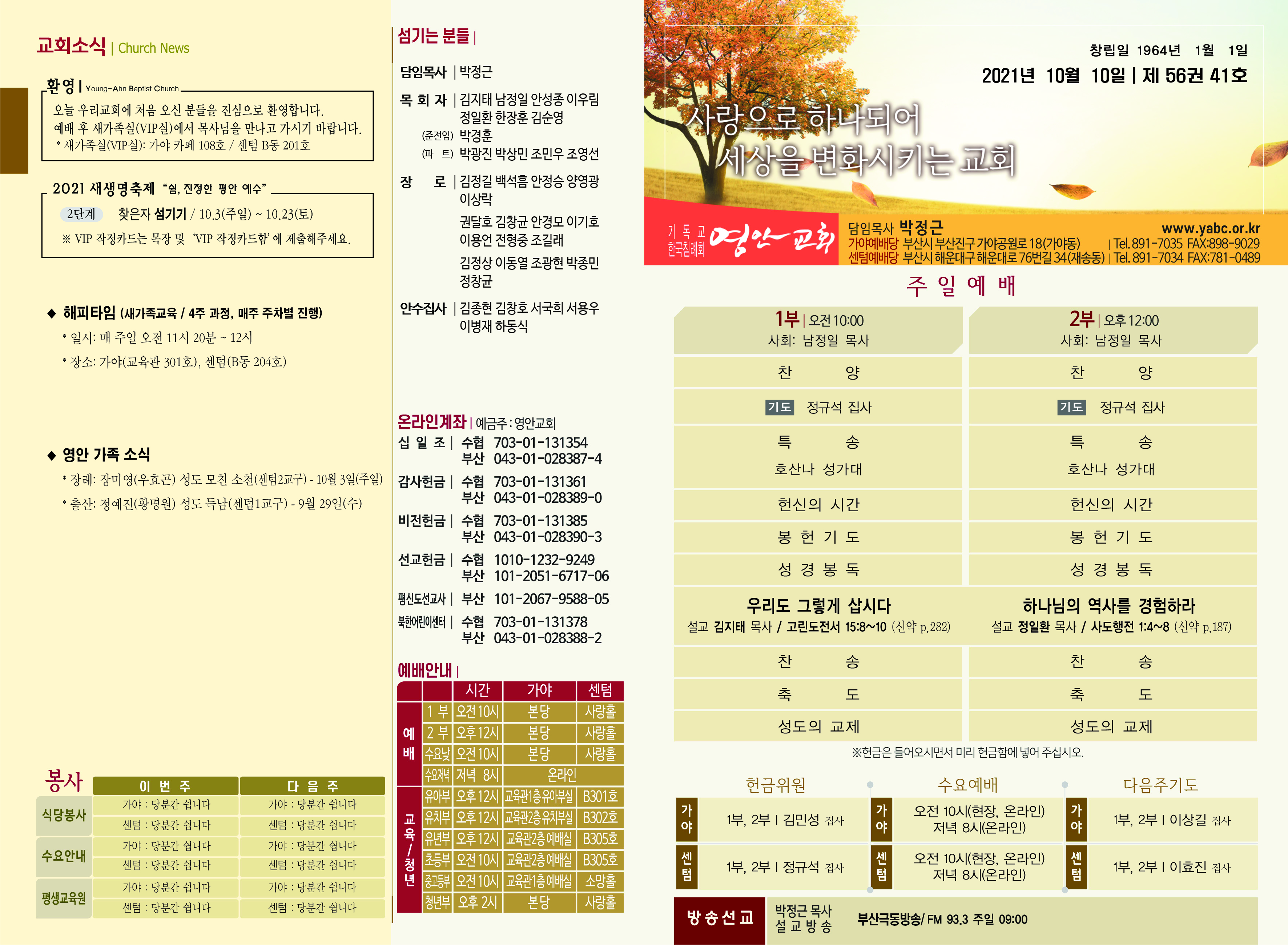 2021년 10월 10일 주보 (센텀예배당) 페이지 정보 작성자 관리지기 작성일21-10-08 13:54 조회5,514회 댓글0건 관련링크 목록 본문 *2021년 10월 10일 주보 (센텀예배당) 댓글목록 등록된 댓글이 없습니다. 목록