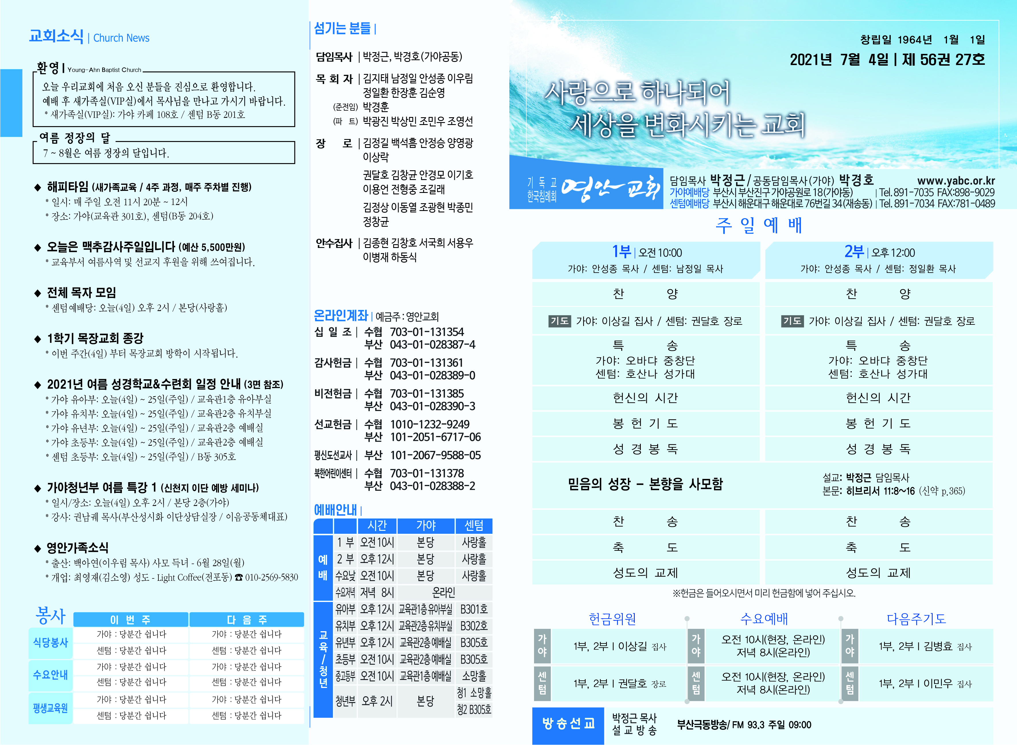 2021년 7월 4일 주보 페이지 정보 작성자 관리지기 작성일21-07-03 11:13 조회6,273회 댓글0건 관련링크 목록 본문 *2021년 7월 4일 주보 댓글목록 등록된 댓글이 없습니다. 목록