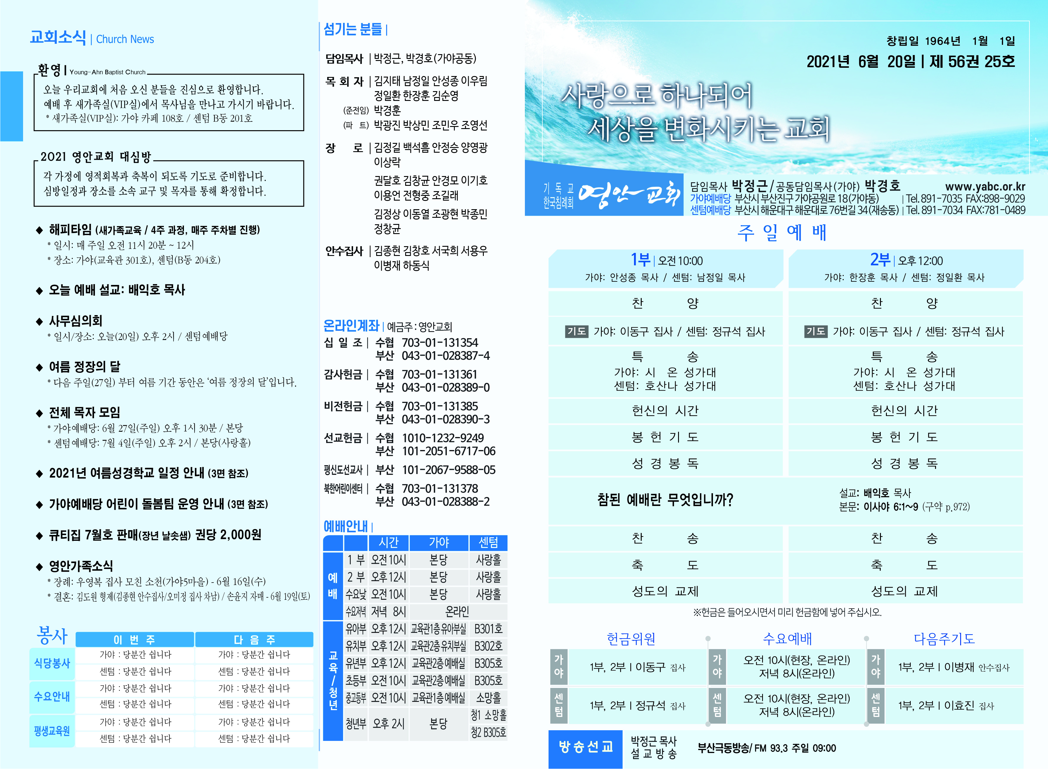 2021년 6월 20일 주보 페이지 정보 작성자 관리지기 작성일21-06-19 11:04 조회6,022회 댓글0건 관련링크 목록 본문 *2021년 6월 20일 주보 댓글목록 등록된 댓글이 없습니다. 목록