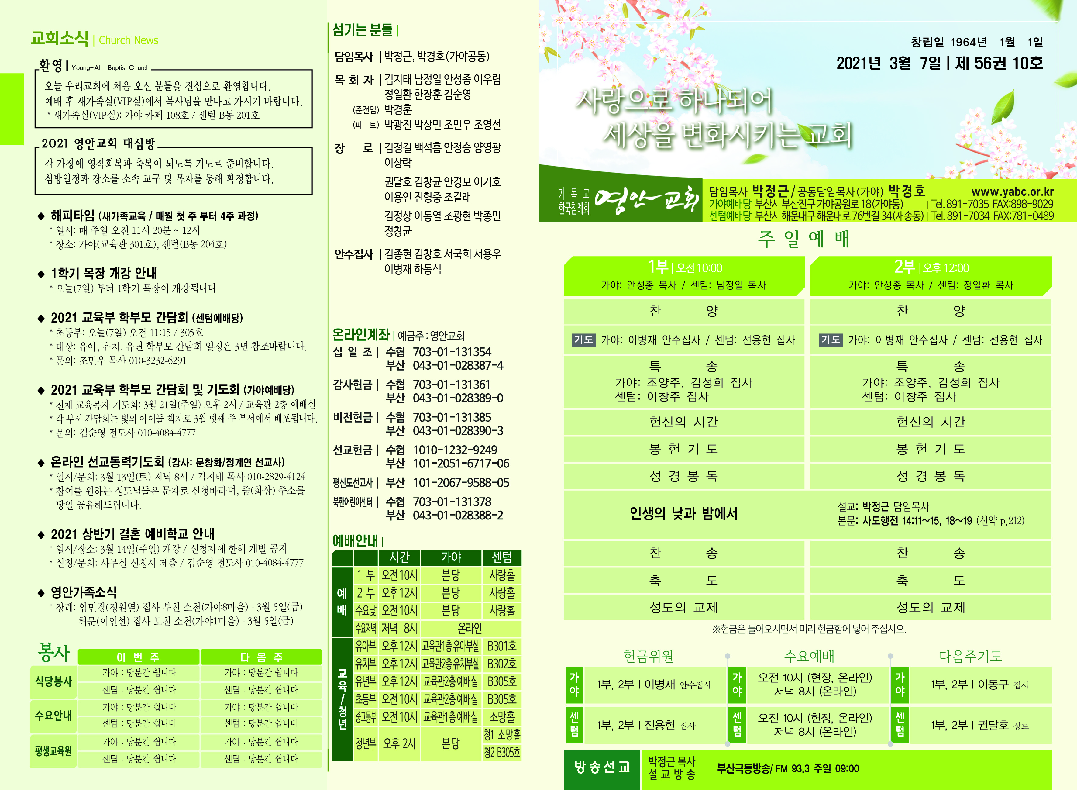 2021년 3월 7일 주보 페이지 정보 작성자 관리지기 작성일21-03-06 11:10 조회6,585회 댓글0건 관련링크 목록 본문 2021년 3월 7일 주보 댓글목록 등록된 댓글이 없습니다. 목록