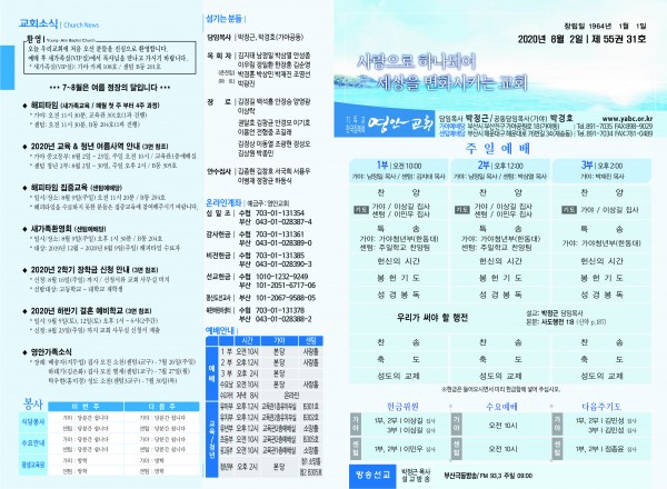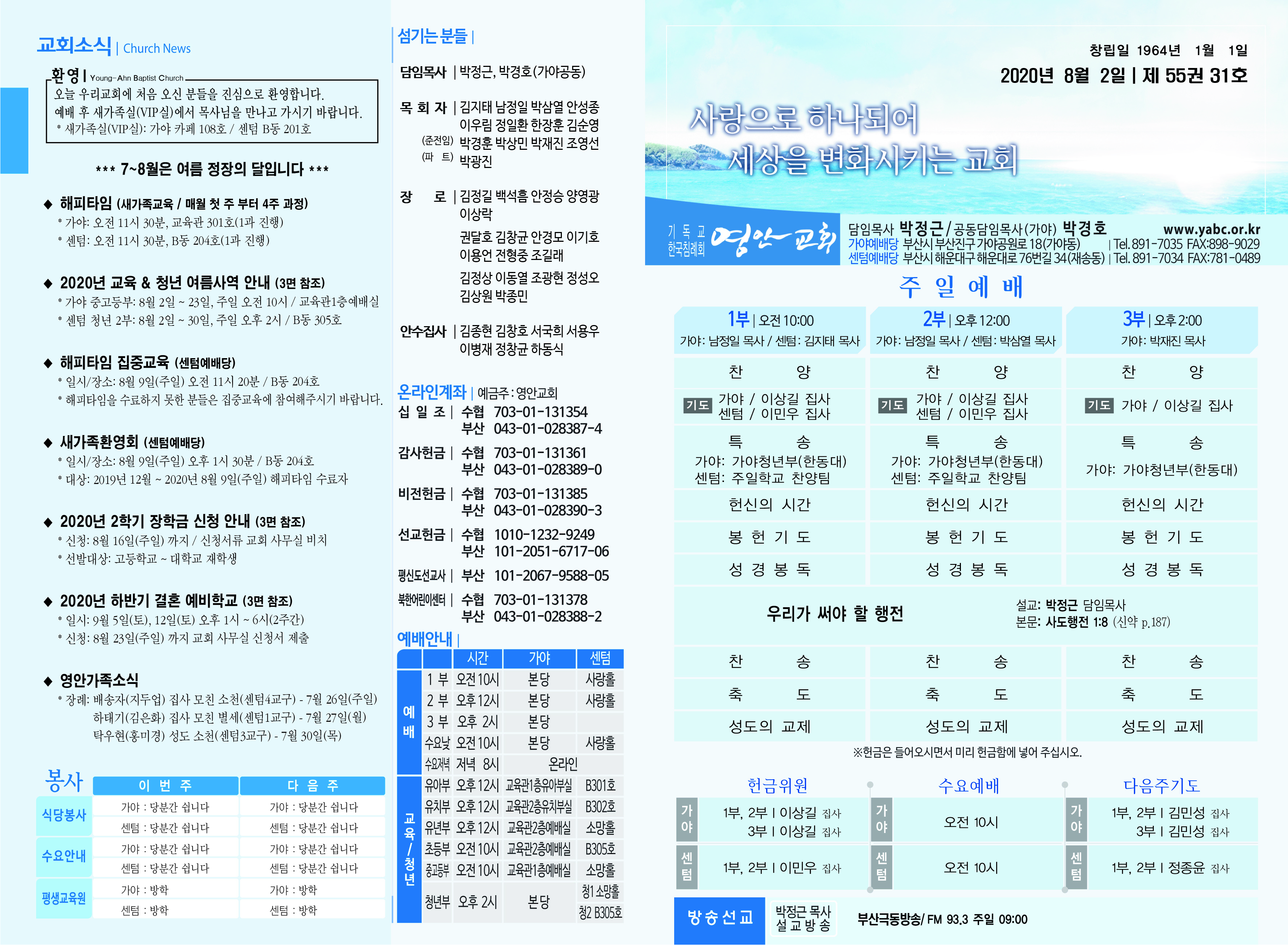 2020년 8월 2일 주보 페이지 정보 작성자 관리지기 작성일20-08-01 11:37 조회7,652회 댓글0건 관련링크 목록 본문 2020년 8월 2일 주보 댓글목록 등록된 댓글이 없습니다. 목록