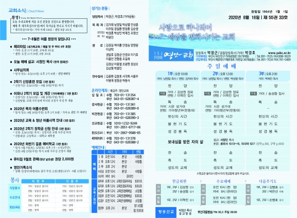 2020년 8월 16일 주보 페이지 정보 작성자 관리지기 작성일20-08-14 13:56 조회7,335회 댓글0건 관련링크 목록 본문 2020년 8월 16일 주보 댓글목록 등록된 댓글이 없습니다. 목록