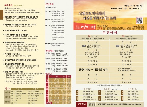 2016년 10월 23일 주보 페이지 정보 작성자 관리지기 작성일16-10-22 11:58 조회12,747회 댓글0건 관련링크 목록 본문 2016년 10월 23일 주보 댓글목록 등록된 댓글이 없습니다. 목록