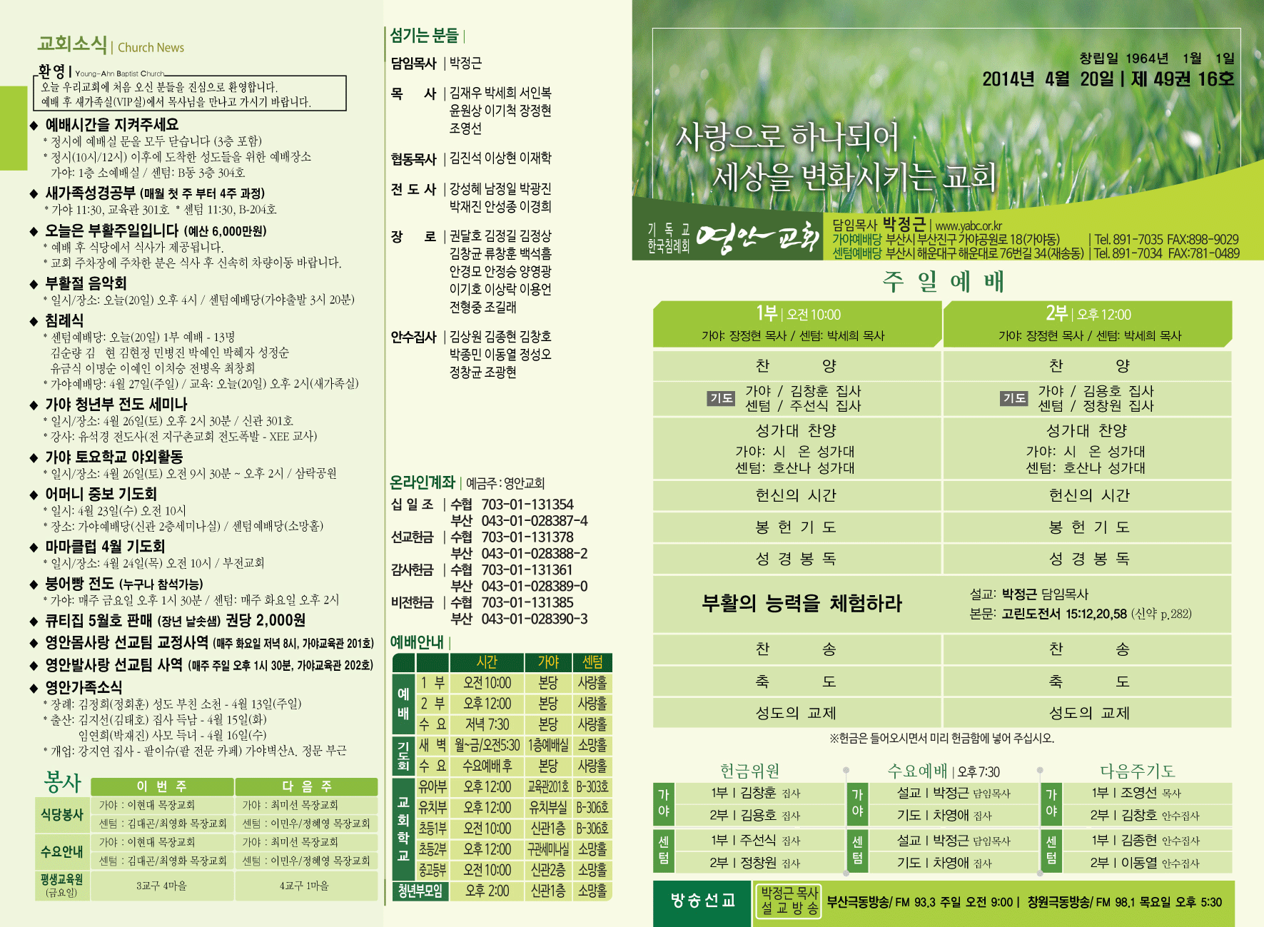 2014년 4월 20일 주보 페이지 정보 작성자 yabc 작성일14-04-19 00:00 조회9,932회 댓글0건 관련링크 목록 본문 2014년 4월 20일 주보 댓글목록 등록된 댓글이 없습니다. 목록