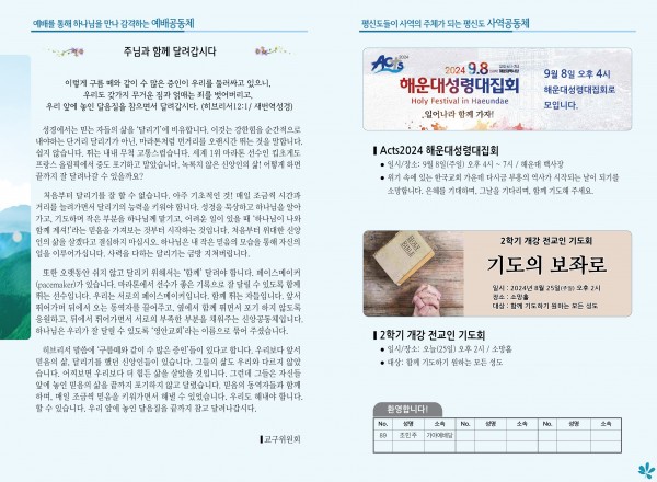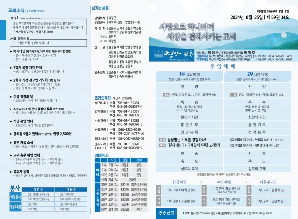 2024년 8월 25일 주보 (센텀예배당) 페이지 정보 작성자 관리지기 작성일24-08-24 10:51 조회1,806회 댓글0건 관련링크 목록 본문 2024년 8월 25일 주보 (센텀예배당) 댓글목록 등록된 댓글이 없습니다. 목록